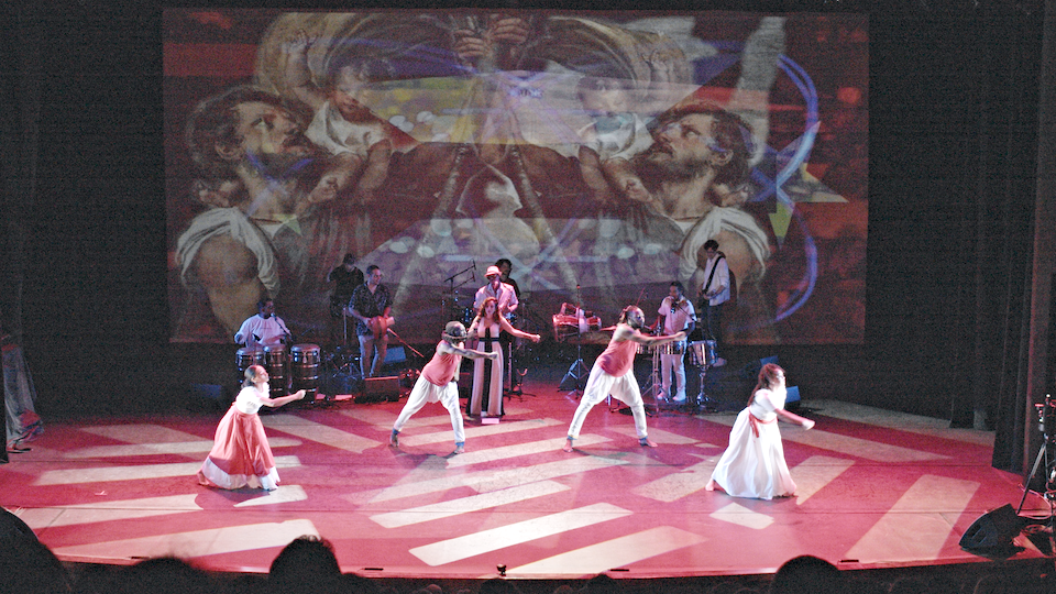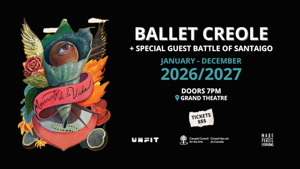 Our show Movimientos de la Vida is a powerful collaboration between Ballet Creole, Juno-nominated Latin alternative group The Battle of Santiago, and Cuban visual artist Yaimel Lopez. It tells the story of refugees leaving home—balancing loss, guilt, and the hope of starting new—through Afro-Caribbean and Latin dance, six live musicians, immersive projections, and spoken word.